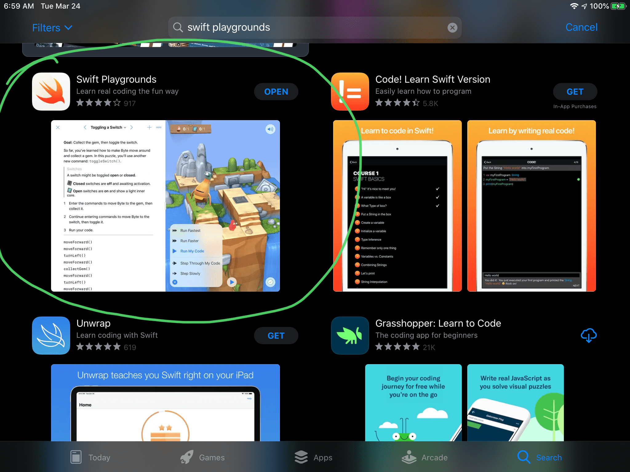 Apple provides an excellent array of playgrounds authored to teach you how to code, to learn augmented reality development. Or some innovative uses of content and code like the Cipher playground. The app is free, as are playgrounds you can download from Apple and third parties (like The Code Hub).